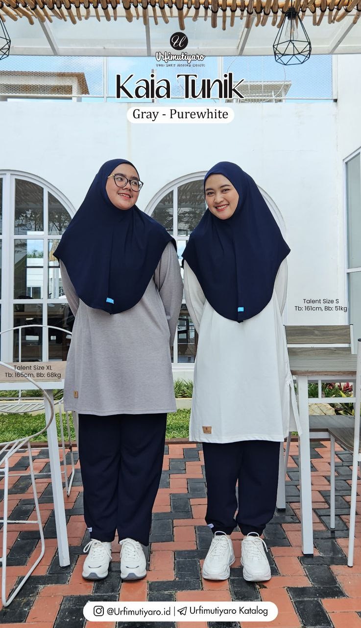 Kaia tunik menggunakan material baby terry, yang memiliki karakteristik tebal, stretch, tidak jiplak dan tidak transparan sehingga nyaman untuk dipakai aktivitas sehari-hari. Detail Kaia tunik, terdapat kancing di belakang untuk akses opening, cutting lengan model pipa (acuan cutting lengan: Kaia PUREWHITE & BLACK). Terdapat label kulit Urfimutiyaro di bagian bawah kanan bawah tunik.