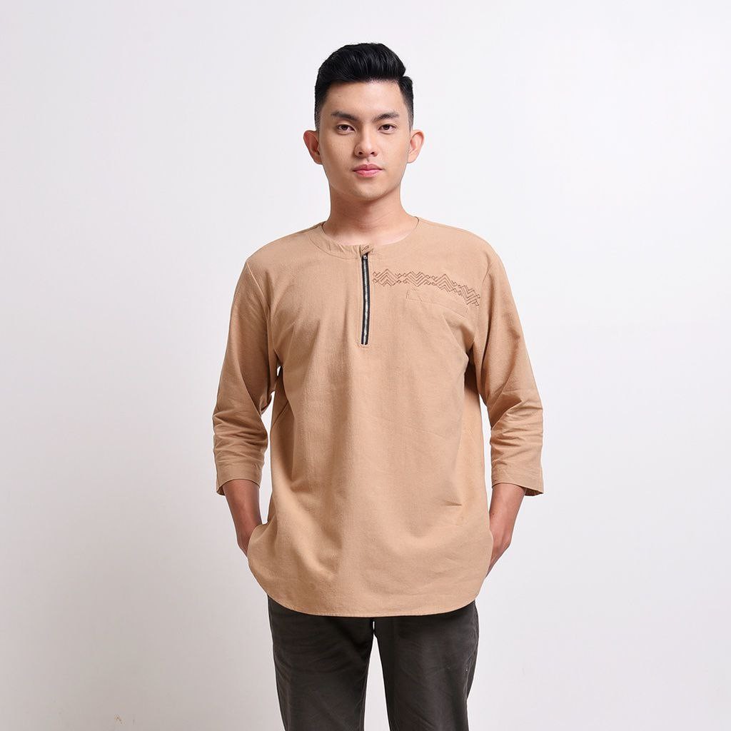 -Kurta Nayef Desain dengan lengan tanggung agak lebih longgar di bagian badan sehingga nyaman dikenakan. bukaan menggunakan zipper. terdapat motif pada bagian atas saku. bahan katun menyerap keringat. size chart terlampir.
