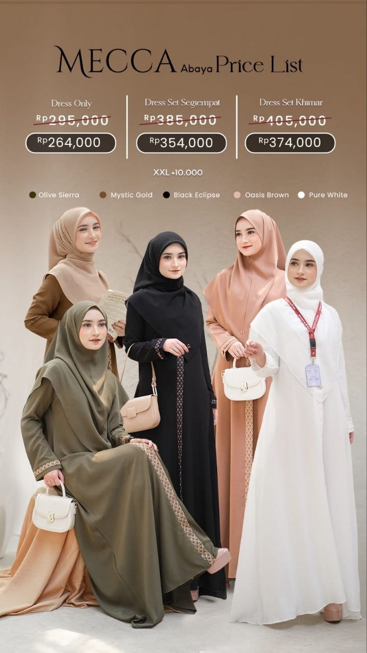 🌸 Spesifikasi Mecca Abaya: * Menggunakan material Madam Pretty berbahan adem dan tidak mudah kusut * Detail list brokat pada bagian depan yang membuat semakin terlihat slim dan jenjang * Manset tangan loose dengan aksen brokat terlihat semakin manis dan anggun saat di gunakan dan wudhu friendly * Terdapat Metal tag Salvina di bagian manset * Menggunakan resleting depan * Terdapat saku disisi kanan * Lebar rok -+ 2,3 meter * Terdapat pilihan size : XS, S, M, L, XL, XXL. * Terdapat 5 pilihan warna: - Black Eclipse - Pure White - Mystic Gold - Olive Sierra - Oasis Brown