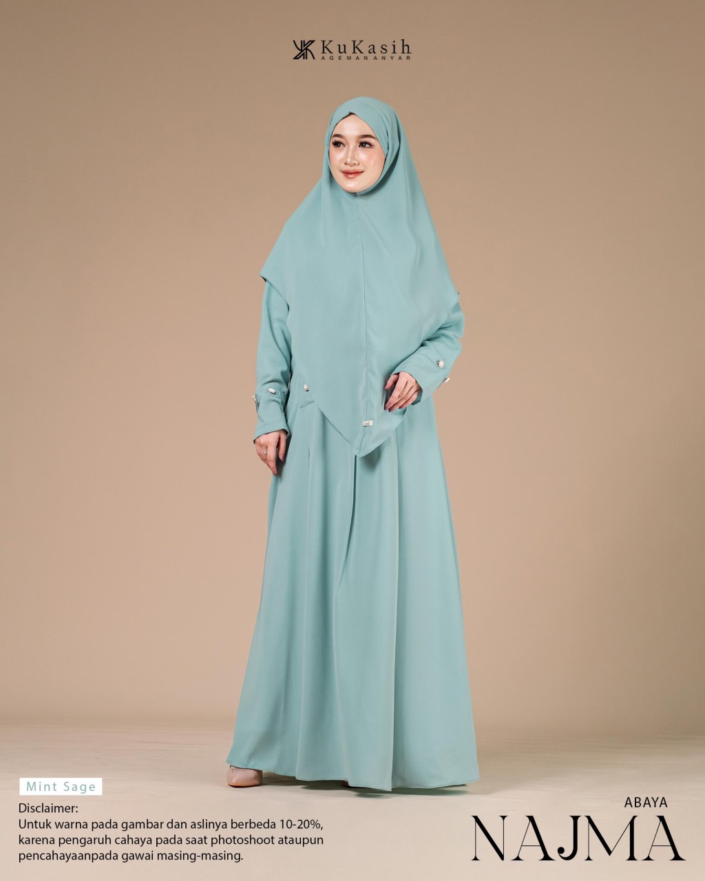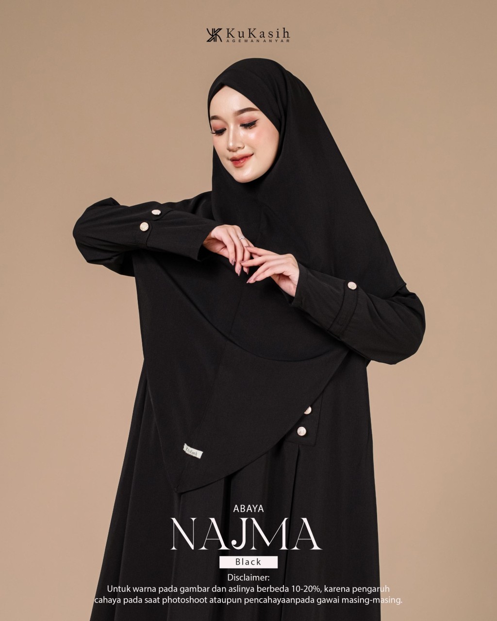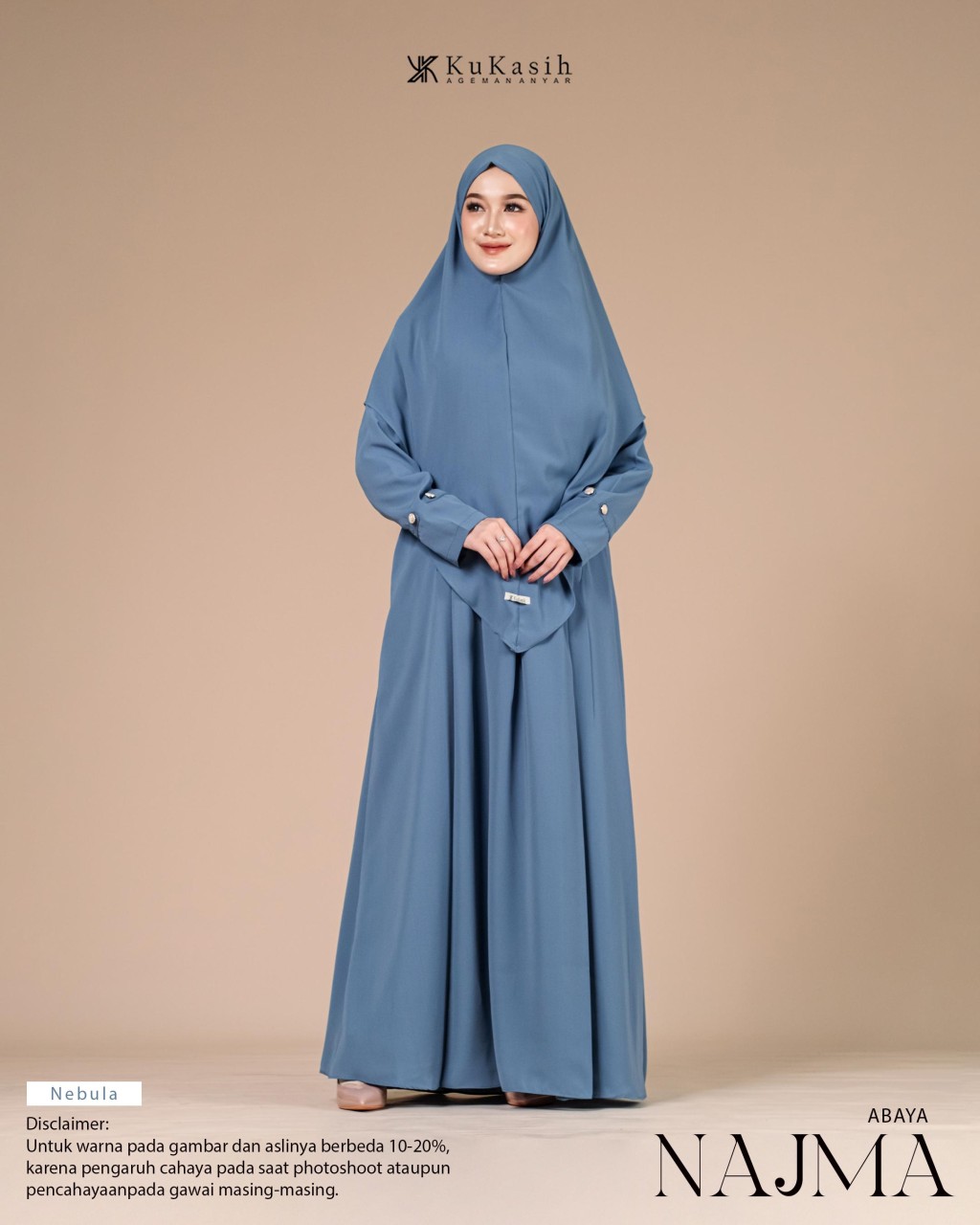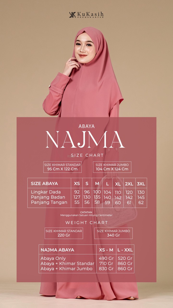 Sebuah karya terbaru dan pastinya terbaik dari Kukasih.id . Special Kukasih.id , mempersembahkan Najma abaya .Najma Abaya terbuat dari bahan harmoni premium yang berbahan dasar polyester tenun dengan karakteristik halus, adem, flowly, memiliki tampilan mewah dan sedikit glossy. Material ini juga ringan, menyerap keringat, tidak mudah kusut, dan nyaman dipakai seharian.