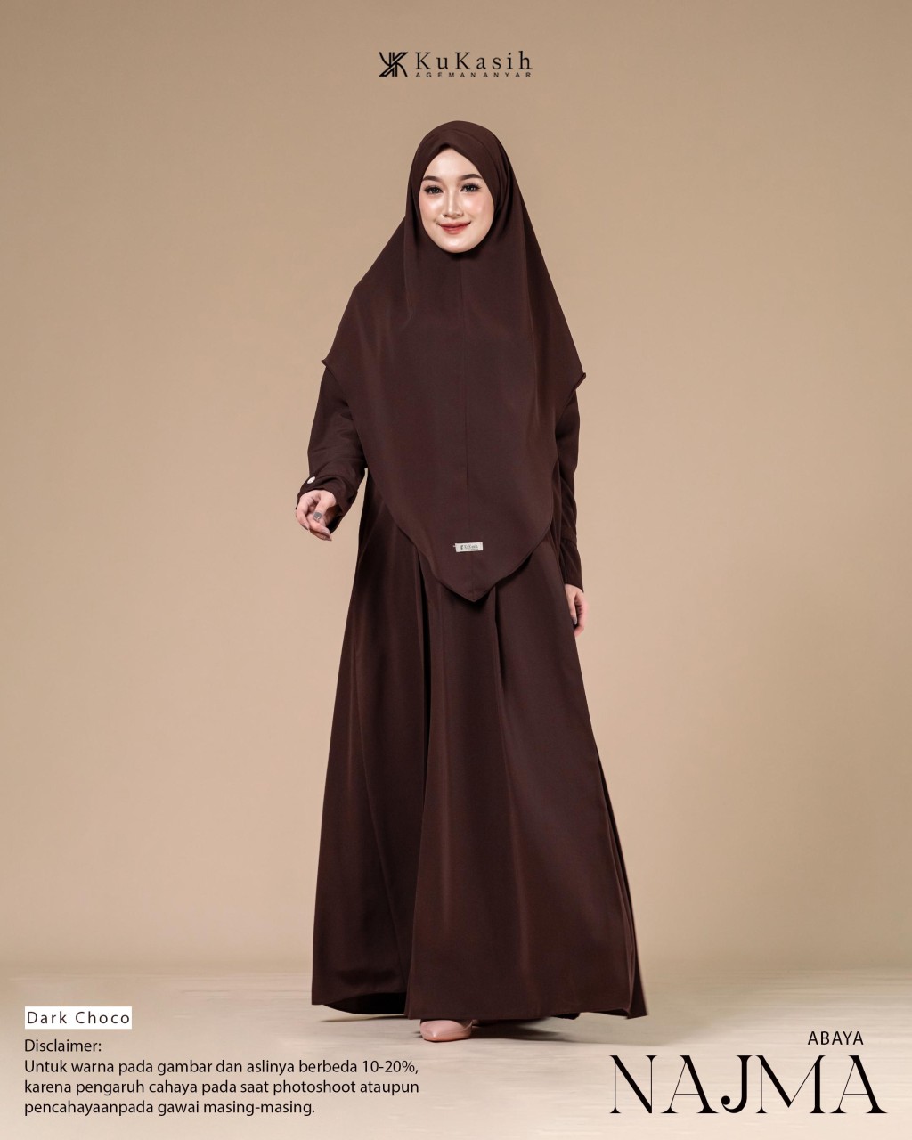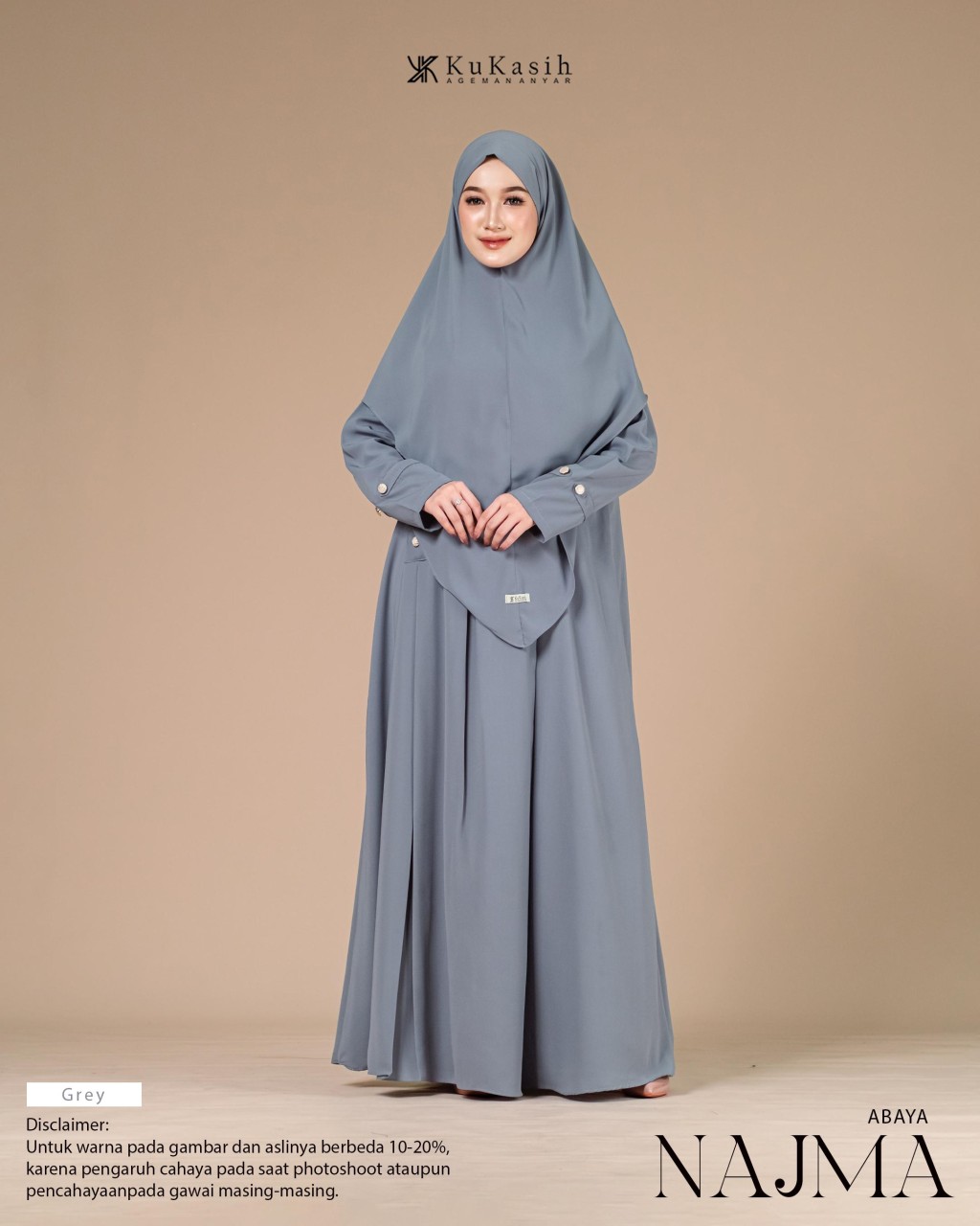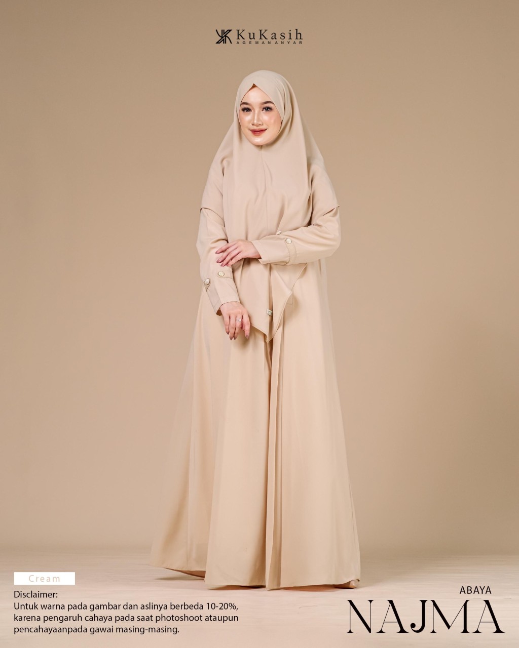 Sebuah karya terbaru dan pastinya terbaik dari Kukasih.id . Special Kukasih.id , mempersembahkan Najma abaya .Najma Abaya terbuat dari bahan harmoni premium yang berbahan dasar polyester tenun dengan karakteristik halus, adem, flowly, memiliki tampilan mewah dan sedikit glossy. Material ini juga ringan, menyerap keringat, tidak mudah kusut, dan nyaman dipakai seharian.