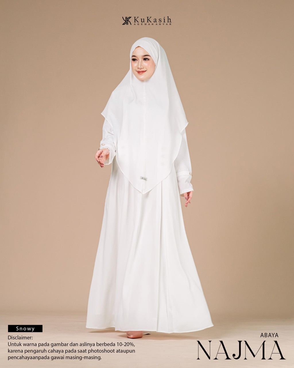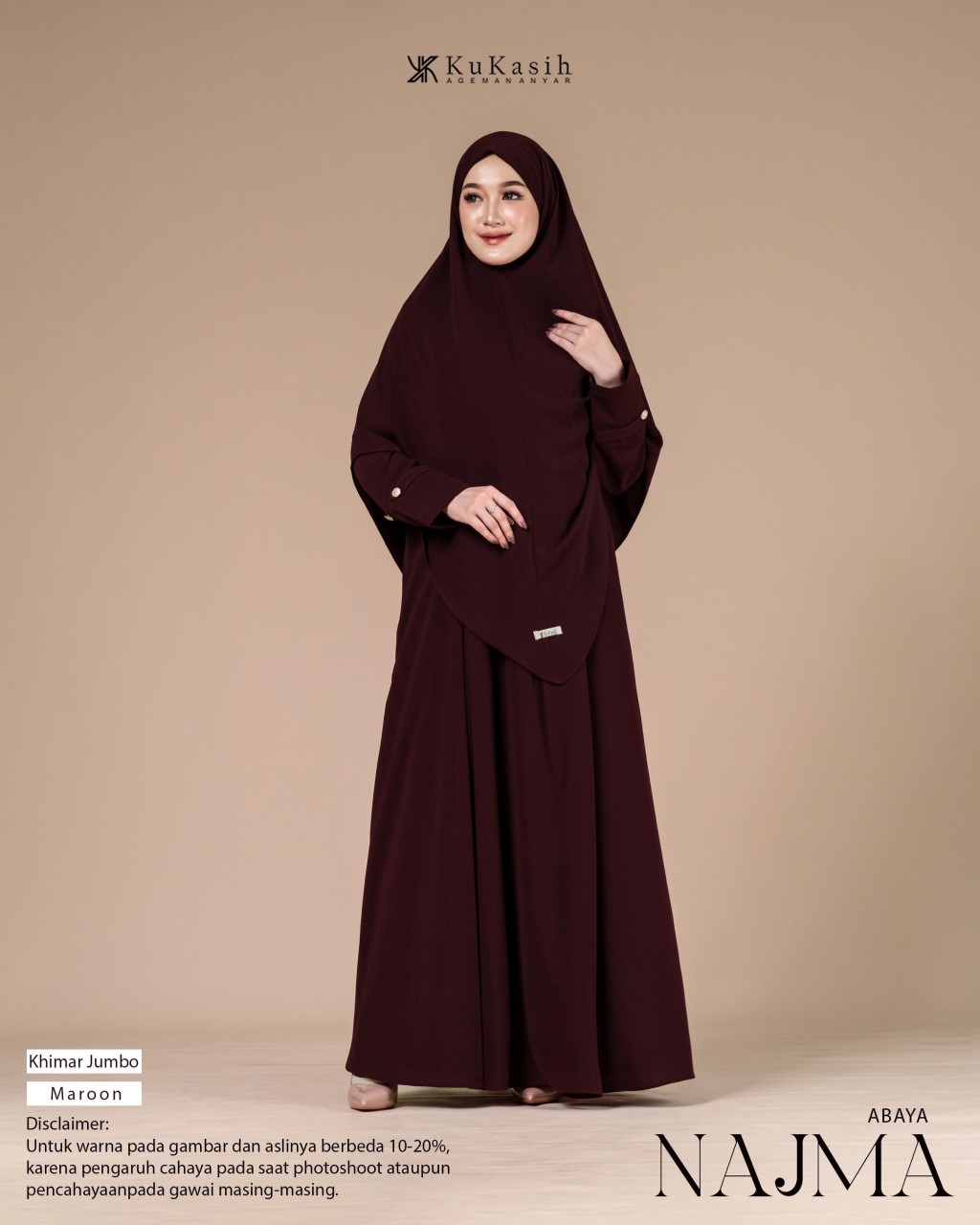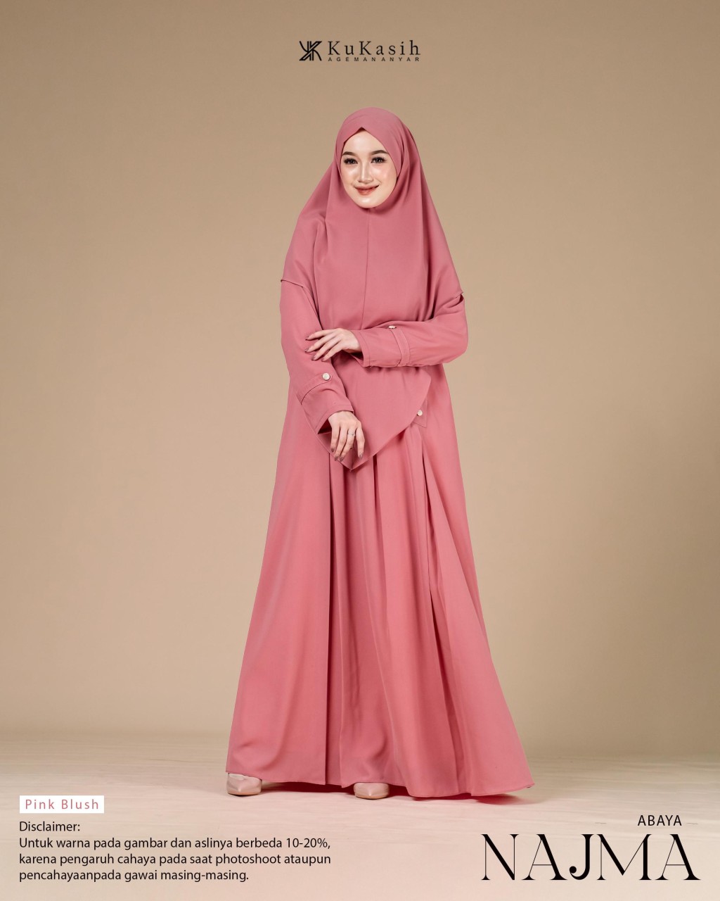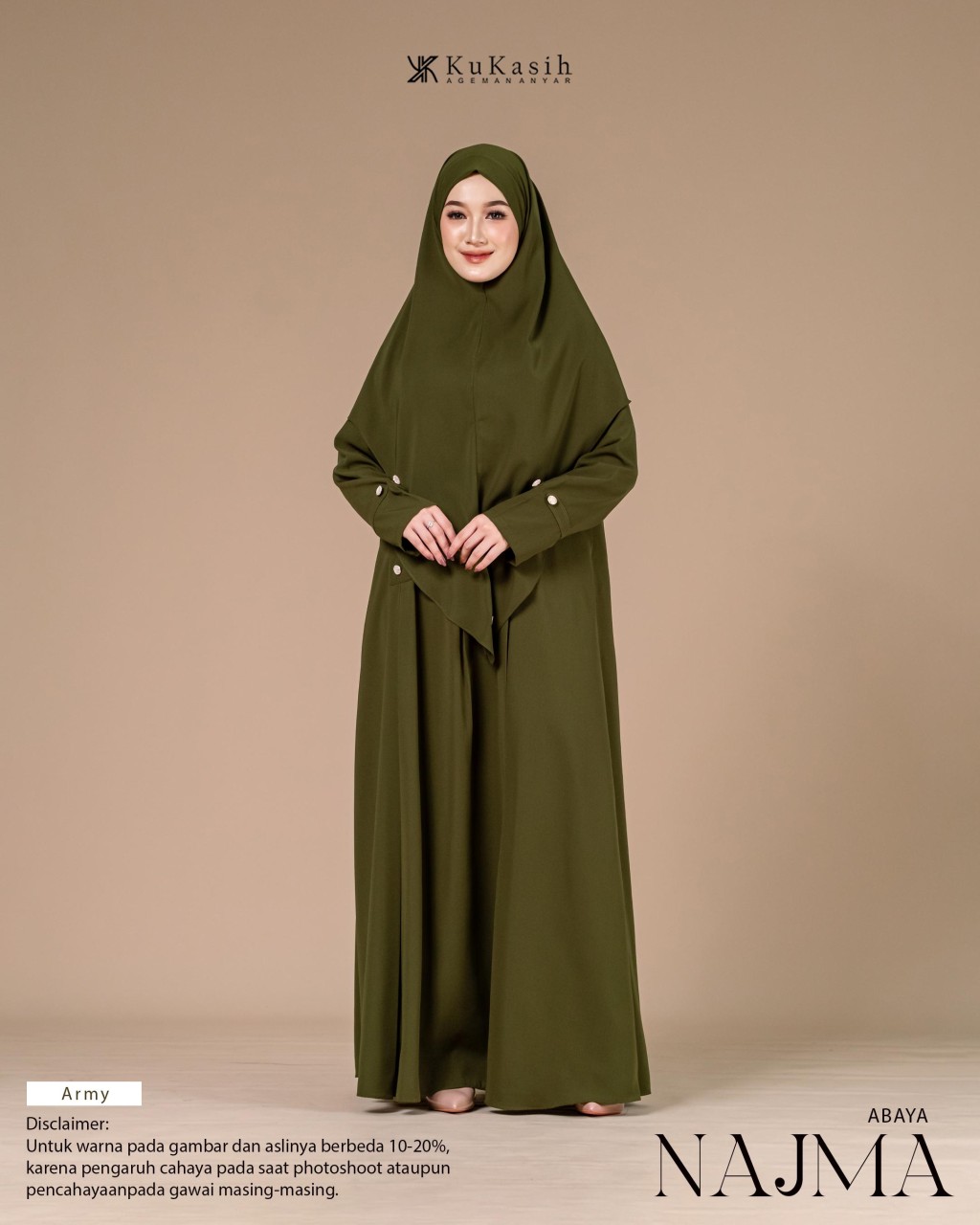 Sebuah karya terbaru dan pastinya terbaik dari Kukasih.id . Special Kukasih.id , mempersembahkan Najma abaya .Najma Abaya terbuat dari bahan harmoni premium yang berbahan dasar polyester tenun dengan karakteristik halus, adem, flowly, memiliki tampilan mewah dan sedikit glossy. Material ini juga ringan, menyerap keringat, tidak mudah kusut, dan nyaman dipakai seharian.